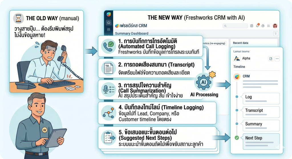 ตอบ: ทันทีที่วางสาย ระบบจะทำการบันทึกการโทรอัตโนมัติ (Automated Call Logging), ถอดเสียงสนทนาเป็นข้อความ (Transcript), สรุปใจความสำคัญ (Call Summarization), บันทึกลงไทม์ไลน์ของลูกค้า, และแนะนำขั้นตอนต่อไป (Suggested Next Steps) ให้ทันที